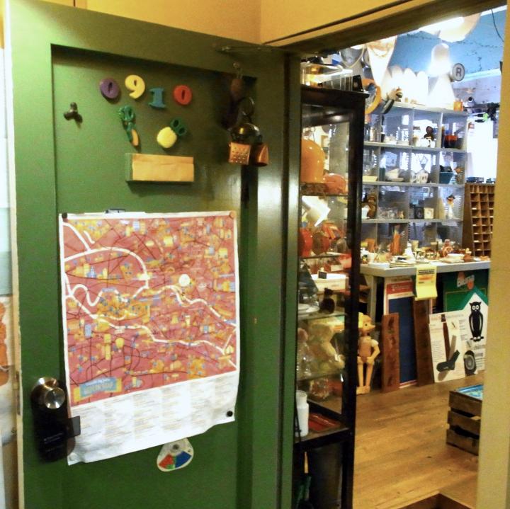 JR総武線「馬喰町」駅から徒歩3分。雑居ビルの入り口にさり気なく置かれたドイツ語の小さな黒板が目印。うっかりしていると気づかずに通り過ぎてしまいそうなほどのシンプルさですが、3階まで上がると、看板代わりの自転車が出迎えてくれます。 「マルクト」では、年に2度ほどの海外買い付けで、その時々に出会ったアイテムを仕入れています。ドイツの人々が日常的に使っていた古い雑貨には、現代の製品にはないおもしろさがあり、ついつい長居してしまいそうです。