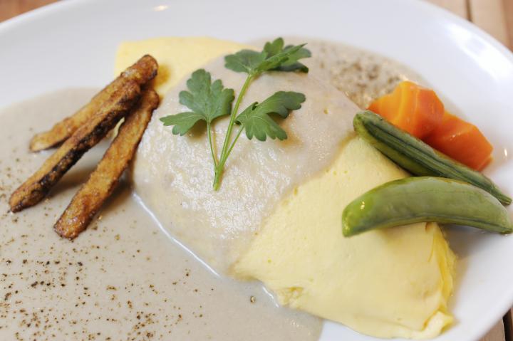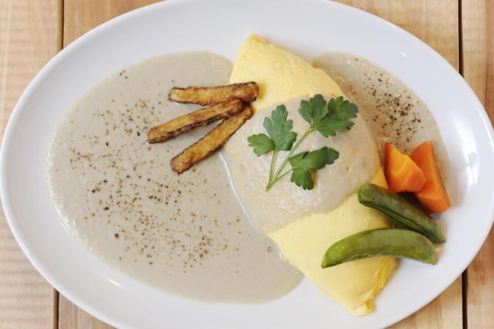 看板メニューのオムライスは4種類あって、どれも好評。風味豊かなバターライスやトマトソースのライスを、ふわふわした玉子でやさしく包んだ自慢の4皿です。 なかでも人気なのが「ごぼうポタージュオムライス」(800円)。オムライスにかけられた食物繊維たっぷりのごぼうのポタージュは、素朴な香りでオムライスのほのかな甘みを引き立てます。スプーンを入れると玉子がとろりとバターライスにからまる絶妙な仕上がり。添えられた香ばしく揚げたごぼうが、味のアクセントになっています。 トマトソースを使って自分でデコレーションできる「お絵かきオムライス」(800円)もあるので、子供と一緒に行ってみても楽しめそうです。