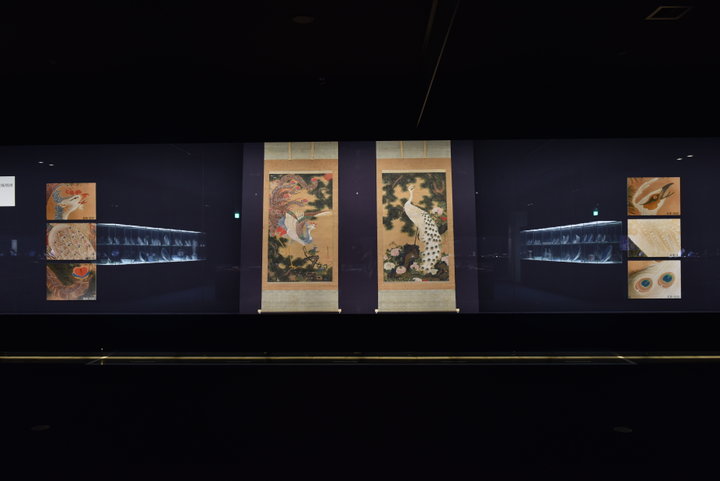 若冲の特徴は、その筆遣いにも見られます。 若冲の絵はあらゆる部分がとても丁寧に緻密に描かれていますが、下書き用の輪郭線がなく、書き直しのできない絹地に一気に筆を入れているのがわかります。 無数の線を組み合わせて描かれた羽は、寸分の狂いや書き損じがなく、その技術の高さと精神力に目を見張ります。 「梅花小禽図」「雪中雄鶏図」など、ほかの作品もじっくり鑑賞して、若冲の世界に浸ってみましょう。