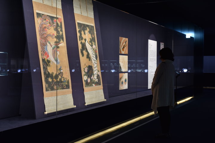 本展でもっとも注目の作品は一対の掛け軸「孔雀鳳凰図」です。83年ぶりに再発見されたこの作品は、若冲が40代前半に描いた初期の作品で、傑作の一つに数えられるものです。 さっそく作品を見てみましょう。 左側にあるのが、松の木の上で色鮮やかな羽を広げ、太陽を見上げる伝説の鳥・鳳凰、そして右側にあるのが、牡丹に囲まれた石の上にたたずむ純白の孔雀の絵です。 作品を前にして驚くのは、その色彩の鮮やかさです。顔料の数が限られていた時代に、特別な絵の具を使わずにどうやってこのような色を表現したのでしょうか。