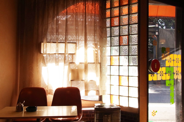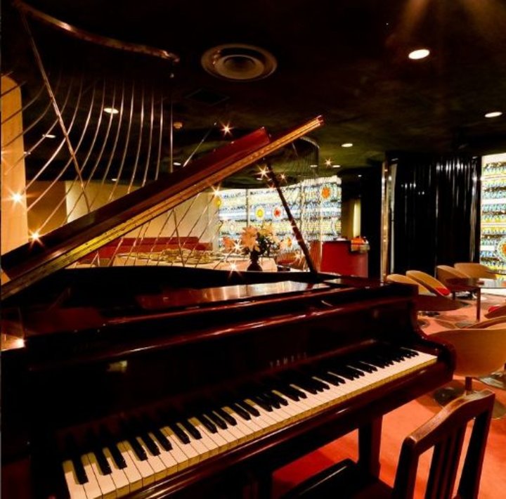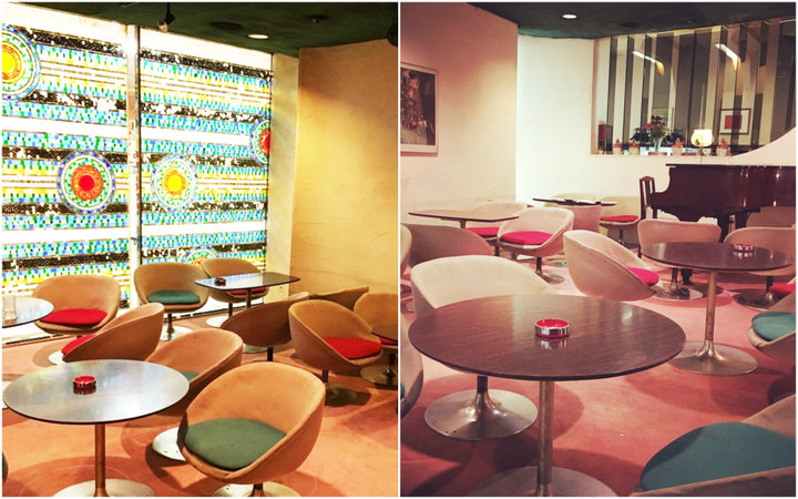 店内には大きなグランドピアノがあり、ゴージャスな雰囲気を漂わせている大人の喫茶店ですが、価格はとてもお手頃。色とりどりのガラスで作られた壁を彩る模様が美しく、見ているだけで珈琲が5杯くらい飲めそうです。 丸みを帯びた美しい椅子に敷かれたマットの赤と青も綺麗。同じビルにある「マヅラ」は姉妹店ですが、また違う素敵な雰囲気を醸し出しているので迷ったときは是非はしごを。非日常を感じる内装でありながらも、何度も訪れたくなるほっとする空間です。