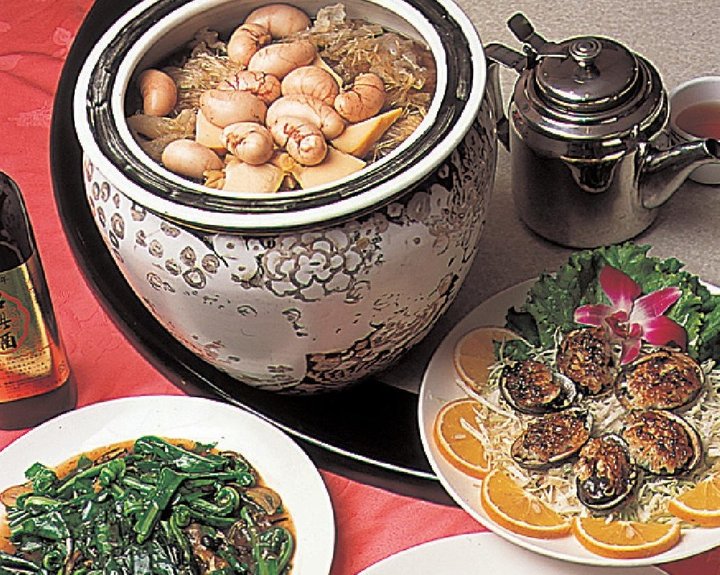 奥が佛跳牆(ファッティウチョン)。手前は青菜を炒めた山蘇(シャンスー)