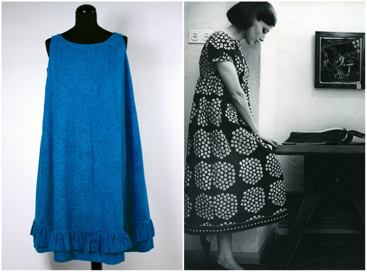 画像左:ジャクリーン・ケネディが購入したドレス≪ヘイルヘルマ≫、1959年、画像右:ファブリック≪ナスティ≫(小さな無頭釘)、1957年、 服飾・図案デザイン:ヴオッコ・ヌルメスニエミ  Design Museum / Harry Kivilinna、画像右:ドレス≪カトリッリ≫、ファブリック≪プケッティ≫(ブーケ)、服飾・図案デザイン:アンニカ・リマラ、1964年 Design Museum Archive / Photo: Seppo Saves