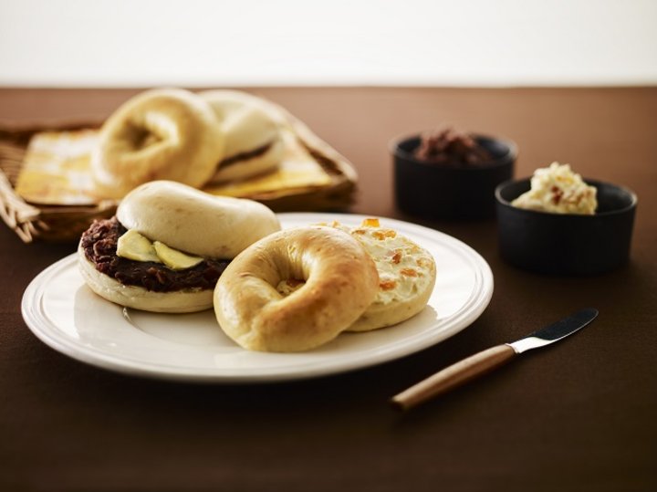 「ジュノエスクベーグル」ならではの、生地のもっちり感と相性抜群。「ブラッドオレンジベーグル」と「小倉マーガリンベーグルサンド」(各500円)