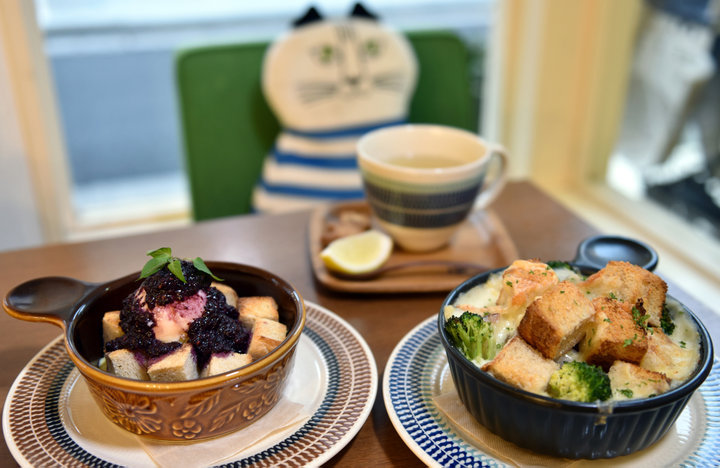 千駄木にある「パングラタンとのみもの つむぐカフェ」は、北欧デザインが大好きなご夫婦が切り盛りする小さなカフェ。看板メニューの「パングラタン」は、天然酵母使用のパンからソースまで、奥の厨房で毎日仕込んでいるそう。食事系グラタンのほか「デザートパングラタン」もありますよ。温かいうちにめしあがれ。