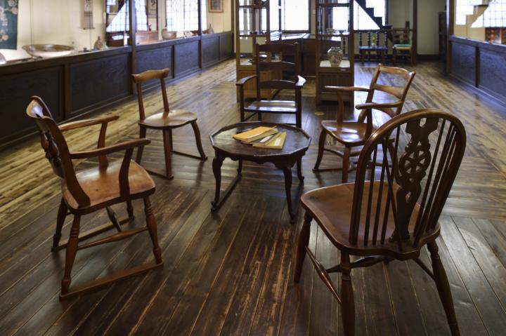 2階展示室の椅子は吉田璋也がデザインしたもの。畳に椅子の脚の跡をつけないよう工夫されている