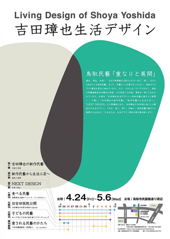 5/6(水・祝)まで、鳥取県鳥取市民藝館通り周辺にて『「吉田璋也生活デザイン」展』が開催されています。 「吉田璋也生活デザイン〜鳥取民藝の重なりと展開〜 」と題し、「吉田璋也の新作民藝」、「新作民藝から生活工芸へ」、「NEXT DESIGN」の3部構成に分け、吉田璋也が80年前に起こした生活デザインをわかりやすく紹介します。 吉田璋也は鳥取民藝美術館で創作のお手本となるような民芸品を展示し、たくみ工芸店で地元の器の販路を開拓、たくみ割烹店でその使い心地を実感する。3つの場所を通して、民芸を体感できる場を作り出した人です。璋也が確立した「知る、使う、買う」という流れの中から生まれた「今を生きる」素敵な生活デザイン用品が多数展示販売されます。 連動企画として「食べる民藝」、「旧吉田医院公開」、「子どもの民藝」を同時開催。日本民藝館 館長の深澤直人氏のスペシャルトークも行われる魅力的なイベントです。ぜひおでかけください。