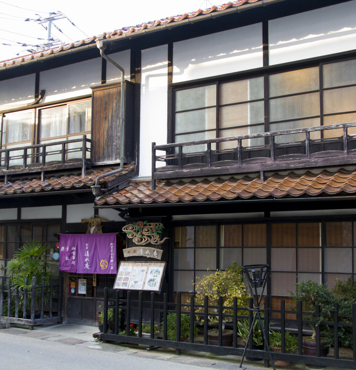 倉吉駅からバスで約15分。「倉吉市打吹地区白壁土蔵群」の道沿いに清水庵はあります。明治時代の建物が多く残る、素朴な町並みのなかにたたずんでいます。