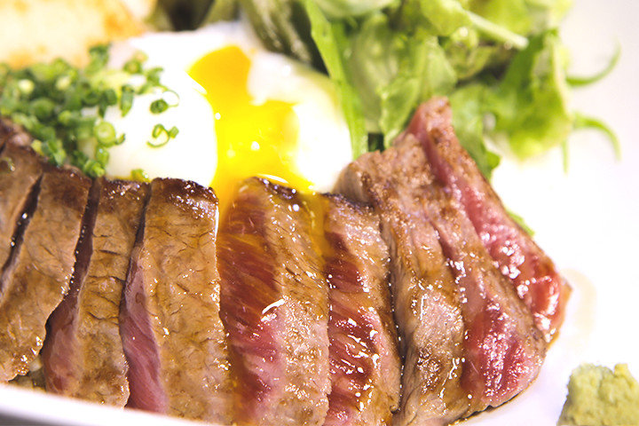 熊本県のブランド牛といえば、阿蘇の大草原で育てられたあか牛。キメ細やかな赤身と適度な脂身が特長で、和牛の中でもヘルシーだと注目を集めています。 肉の旨味を味わうならやはりステーキ。市街地を南北に走る上通アーケードの脇にある「壱之倉庫」では、あか牛の肉の旨味をグリルで堪能できます。 ランチのおすすめは「大阿蘇 赤牛丼」。厚めにカットし、レアに焼き上げたあか牛のステーキが、ごはんが見えないほど敷き詰められています。じゅわっとあふれる肉汁と温泉たまごがトロ~リと絡む、まさに至福の逸品。九州ならではの少し甘みのあるソースが肉の旨みを引き立てます。ボリュームがありそうに見えますが、脂肪分が少ないあか牛なので、女性でもペロリと完食できますよ。