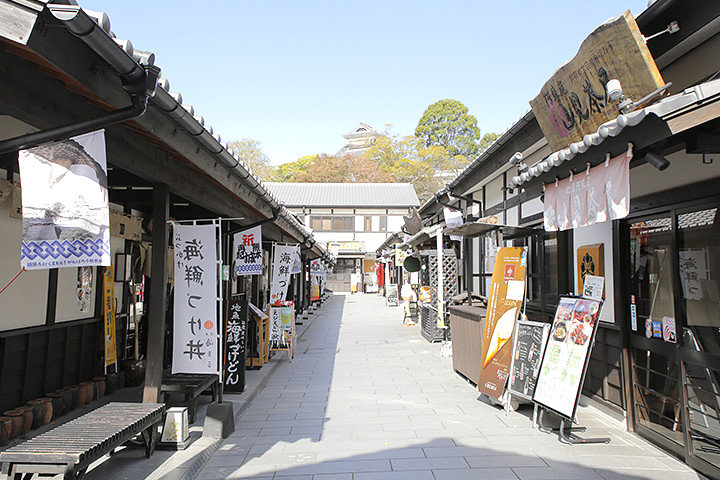 加藤神社とともにぜひ立ち寄りたいのが「桜の馬場 城彩苑(じょうさいえん)」。県内各地の特産品が一堂に会した「桜の小路」や熊本城の歴史や文化を体験できる「湧々座(わくわくざ)」を有する複合施設です。食事処やおみやげ店もあり、初めて熊本を訪れる人には便利なスポットです。
