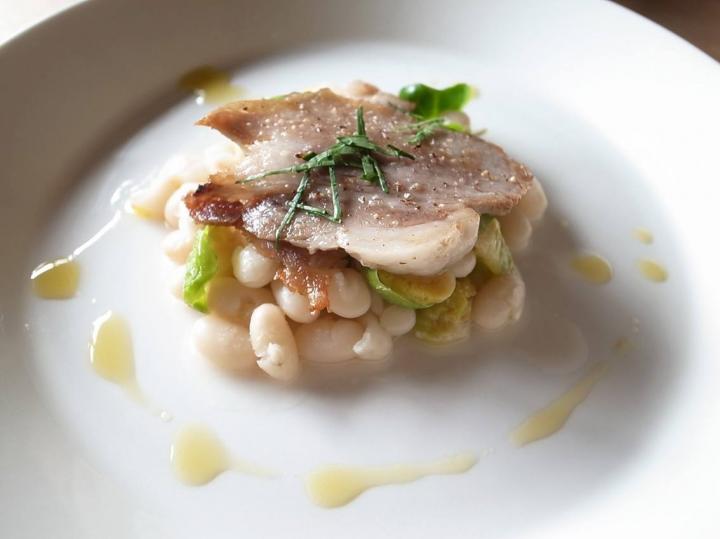 ある日のおまかせコース(5000円)のメイン「もち豚のソテーと白てぼう豆」