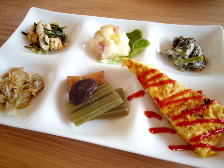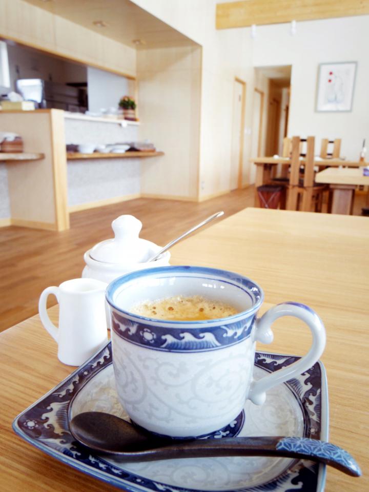 おすすめは日替わりの「ランチセット」(1500円)。プレートに盛り付けられた前菜には、近所の農家からその日仕入れた野菜を中心に十勝産の食材をメニューに取り入れているのだそう。 この日は生姜で味付けた蒸し茄子、ラワンぶきと油揚げの煮物、スペイン風オムレツ、春菊の白和え、キタアカリのポテトサラダ、油揚げの煮浸しの6品。キタアカリのほか、ピンク色のノーザンルビーと、小粒のインカのめざめの3種類のじゃがいもを使ったポテトサラダは、それぞれの甘味や色味などの特徴が楽しめる十勝ならではの一品です。 プレートのほかに濃厚な甘味を感じる雪化粧カボチャのスープ、メインはキノコのホワイトソースがけハンバーグ、そして日替わりのタケノコごはんが付く大満足の内容。 ドリンクにはセットのホットコーヒーを。モカとキリマンジャロのブレンドをミドルローストに焙煎したオリジナルの豆をお店のエスプレッソマシーンで淹れてくれます。しっかりとしたコクとクセのない苦味が楽しめます。