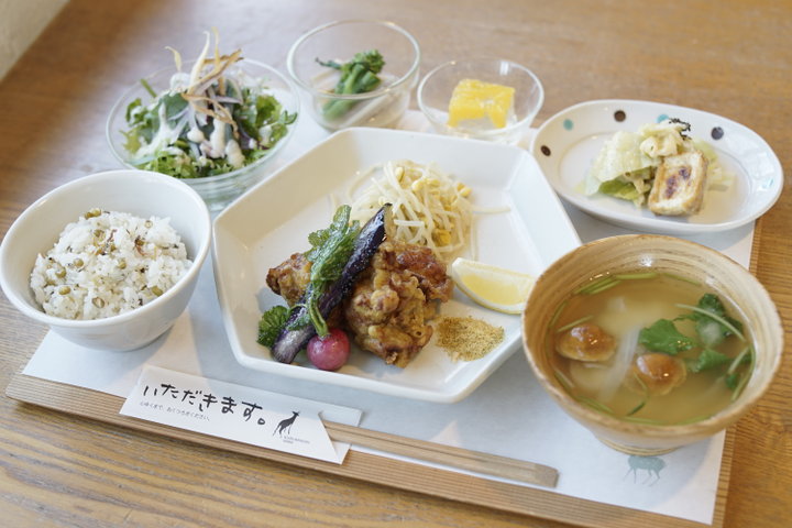 平城宮跡資料館から歩いて5分ほどの場所にある「あみかふぇ」では、県内の契約農家から届く旬野菜をふんだんに使ったランチが味わえます。