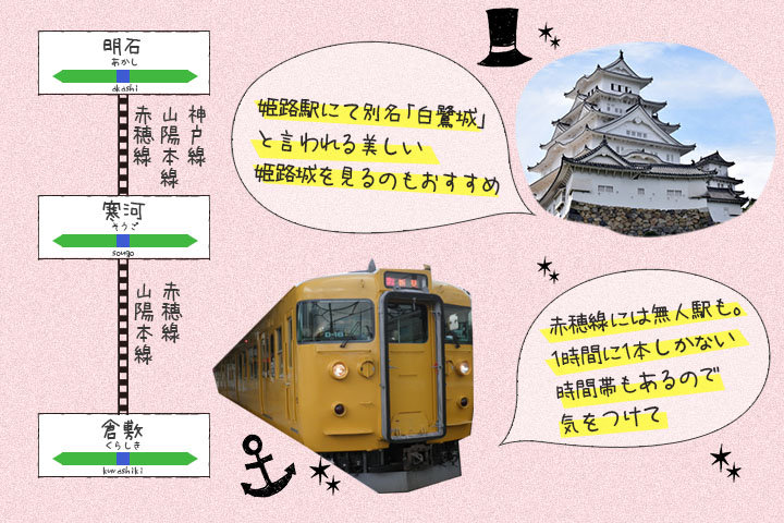 次は明石駅から、岡山県を代表するカキの産地を目指し、寒河(そうご)駅へ。もし時間に余裕があれば、しろさぎ城の異名を持つ真っ白な美しいお城・姫路城を見物に、姫路駅で下車するのもおすすめです。