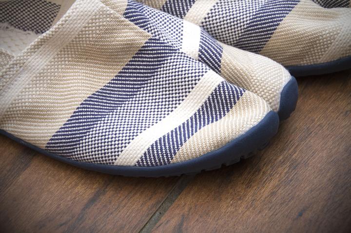 「たびりら」は、岡山・倉敷の老舗足袋メーカー「丸五」が手がけた靴で、リゾートシューズ「エスパドリーユ」をモデルにしています。アッパー素材には倉敷産の帆布生地を使い、縫製から成形まですべて手作業です。 「たびりら」は柔らかく軽いので、キャリーケースやボストンバッグの隅にコンパクトに収納して持ち歩けます。脱ぎ履きも簡単で、お寺や座敷に上がるときはもちろん、運転時の履き替えもスムーズ。ふかふかの砂に足をとられることもないので、リゾート先でのビーチ散策も快適に楽しめます。旅好きにはぴったりですね。 マキシ丈のスカートや、ロールアップしたパンツとの相性抜群。ガウチョパンツと合わせてもかわいいですよ。 色は岡山をテーマにした全7色がラインナップされています。写真の「デニム」と「海」のほかに「雲」・「月」・「島」・「ドット(赤・青)」があります。