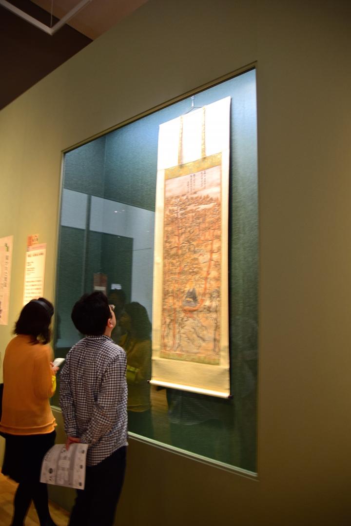 会場に入って最初に注目したいのが鎌倉時代に描かれた国宝「明恵上人像(樹上座禅像 )」。当時の作品としては、とても型破りな仏教肖像画だそうです。 絹ではなく紙を4枚貼り合わせたものに描かれていること、主人公である明恵上人が高僧にも関わらず小さいこと、絵の中に小鳥やリスなどの動物が描かれていることなどが、当時としては異例の作品とされています。まるで山水画の中に溶け込むような人物の描かれ方は、 “人もまた自然の一部である”ということを示しています。 この絵の中で描かれている山の風景は、今も高山寺から見られるそうですよ。