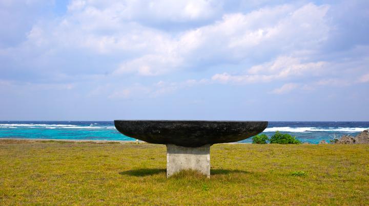 最後に、長崎さんの作品を探して海辺に行ってきました。そこには、台風がきて何度も波をかぶっても絶対に流されないような、強固な石のテーブルがありました。目の高さで海と平行に眺めてみると、水平線と重なることに気づきます。人が気づくかどうかわからないこんな仕掛けをしのばせる長崎さんだけに、きっと『かなしゃ』にも、読み返す時期や場所によって、色んな気づきの扉を仕掛けてあるのではないかとわくわくします。