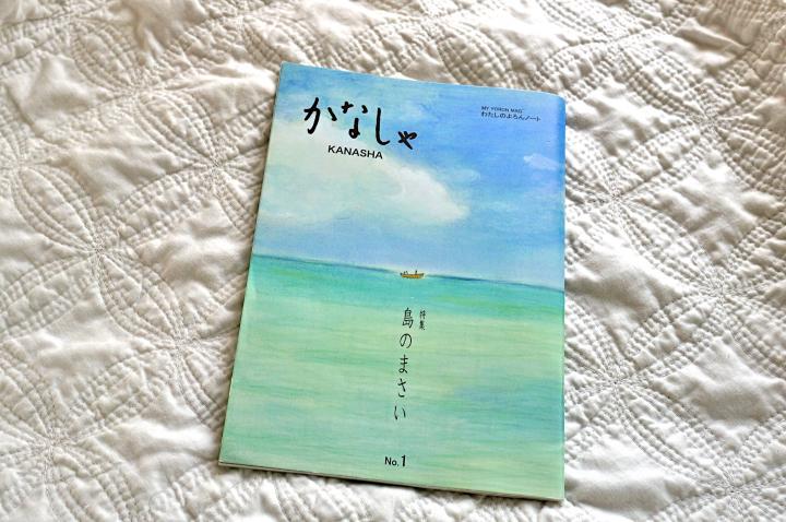 「かなしゃ、いい響きでしょう? 人を慈しむ、愛おしいといった意味がある奄美の方言です。与論では今はほとんど使われていないんですけどね。ポルトガルの"サウダージ"という言葉の意味にも似た”かなしゃ”という言葉を気に入って、冊子の名前にしたんです」。長崎さんはイタリアをはじめ、長く住んだヨーロッパや南米などの港町で出会ってきた明るさと寂しさ、光と陰のなかでたゆたう人間の情感のようなものをこの言葉に感じたそうです。 7年前に両親のルーツのある与論島に引っ越してきたもとくにこさんは、1号目の表紙に海の絵を描きました。手前にあるコバルトブルーの海と奥のほうの深い藍色の海。白い雲、真っ青な空。何層にも重なる青のグラデーションのなかにぽつん、と小船が浮かび、人が乗っています。
