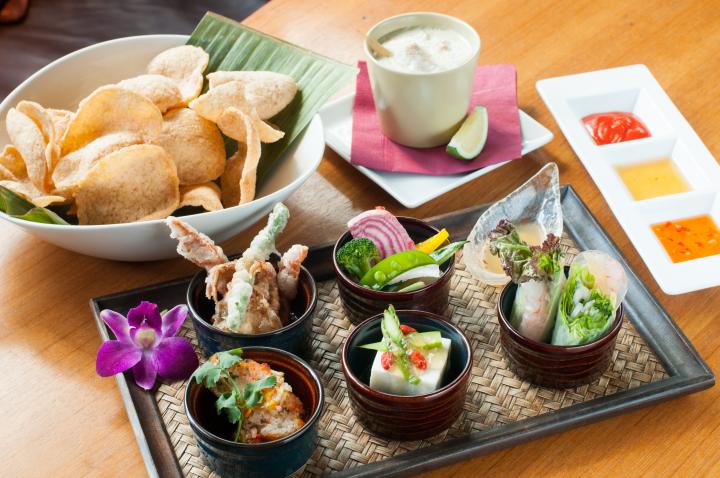 最初に登場する料理は、バリ島でよく見かけるラタンに盛り付けられ、旅気分を感じられる「前菜の5点盛り」。しっとりと味が染み込んだエビトースト、アスパラ豆腐、ソフトシェルクラブのフリット、甘エビとクラゲの生春巻き、そして、新鮮野菜の小さいバーニャカウダは、バリ島でおなじみのサラダ“ガドガド”に使われるピーナッツソースでいただくことができます。 テーブルには常時、サンバル、ナンプラー、スイートチリの3種のエスニックソースをご用意しています。それぞれのソースをちょっとずつつけて、自分の好きな味を見つけてみてくださいね。 濃厚な味わいの「ココナッツスープ」は、ジューシーな鶏肉がごろごろとたくさん入っています。一緒に添えられたライムを搾ると、さっぱりさわやかになり、味の変化を楽しめますよ。 また、エビチップスは常時オンテーブル。こちらはうれしいおかわり自由です。 ウェルカムドリンクは、バリ島をイメージして作られたカクテルの「サンライズオブバリ」。中のグラスを抜くと、リキュールが広がってきれいなグラデーションになります♪自分でカクテルを作っているような気分を味わえておすすめです。2杯目からは飲み放題メニューからお好きなドリンクを楽しめます。