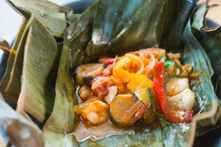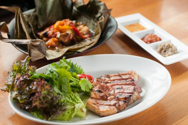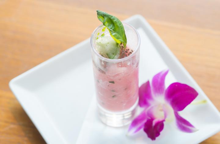 メインディッシュは、魚とお肉のどちらも味わえる豪華なコース。 「松坂豚のグリル」は、3種類のソースをお好みでどうぞ。なかでもおすすめは、瀬戸内海で採れたレモンを使ったレモンサンバルのソース。ジューシーなお肉にさっぱりとした味わいがぴったりとよく合います。パクチー、大葉、ニラなど香草と合わせると、香りも楽しめます。 白身魚をバナナの葉で包んだ、華やかな見た目の「旬の白身魚と野菜のバナナの葉包み蒸し」は、バナナの葉がやさしく香り、アジア版アンチョビのようなカピとトマトで炒めた野菜とともに食べると、まるでラタトゥーユのような味わいです。 メインディッシュのあいだには、試食会でも大好評だった「すいかのスムージー」をご用意しました♪さっぱりとしたスムージーの上には、スーパーフードとして近年話題のチアシードをのせ、甘酸っぱさをプラス。さらに、ミントとバジルをトッピングして、すっきりと仕上げています。