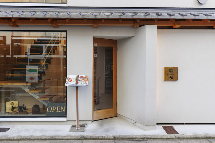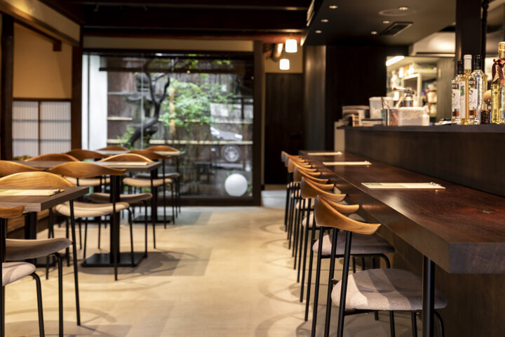 複合ビル「ミーナ京都」裏手の路地裏にある「KOTOWARI(コトワリ)」は、老舗レザー専門店「明石屋」の工房の中にあるレストラン&カフェ。明石屋代表の明石さんと料理長の清水さんが30年来の親友というご縁で生まれたお店です。防空壕を生かした珍しい構造を和モダンにリノベーションした空間。家具などあちこちに革があしらわれているのもすてきです。