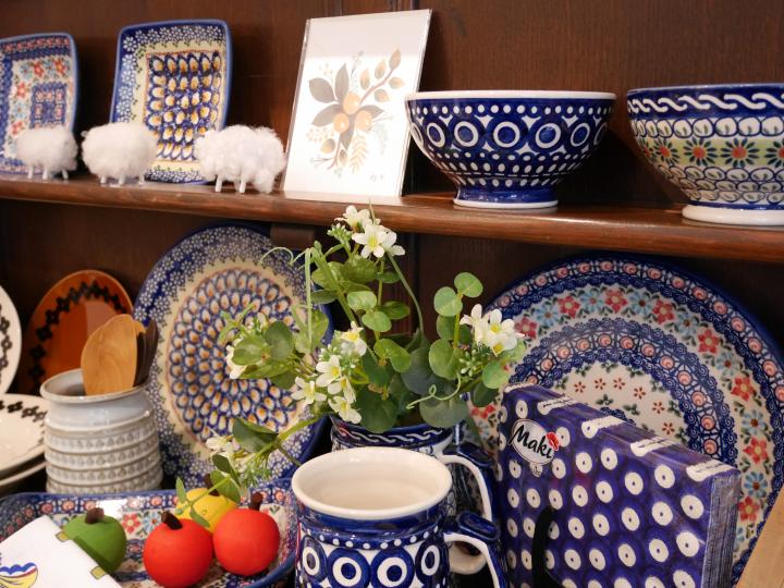 目を引くのは青い絵付けが印象的なポーランドの食器。職人が筆やスポンジスタンプでひとつづつ絵付けしています。すべてがハンドメイドだから手づくりの温もりが伝わってきて、同じものがふたつとないのも魅力的。食卓をぱっと明るくしてれるデザインは、普段使いとしてそろえたいかわいらしさです。