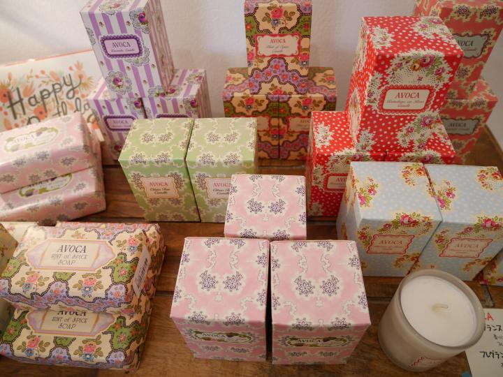 ふわっと鼻をくすぐるやさしい香りに誘われていくと、キャンドルとソープを見つけました。アイルランドで290年の歴史を持つライフスタイルブランドのAVOVA(アヴォカ)のもので、パッケージにはイギリスのヴィンテージファブリックがプリントされています。 香りはキャンドル、ソープともに全部で7種類。マンゴー、グレープフルーツ、シトラス、ローズ、ラベンダー、スパイス、そしてイチジク&ブドウがあります。 キャンドルは大豆成分を100%使用、火を灯しても有害物質が出ないから体にも安心です。ソープは泡立ちがよく、シアバターやパームオイルが配合されているので肌を潤してくれます。部屋に飾ったり、サシェ代わりにクローゼットに忍ばせておくのもいいですね。