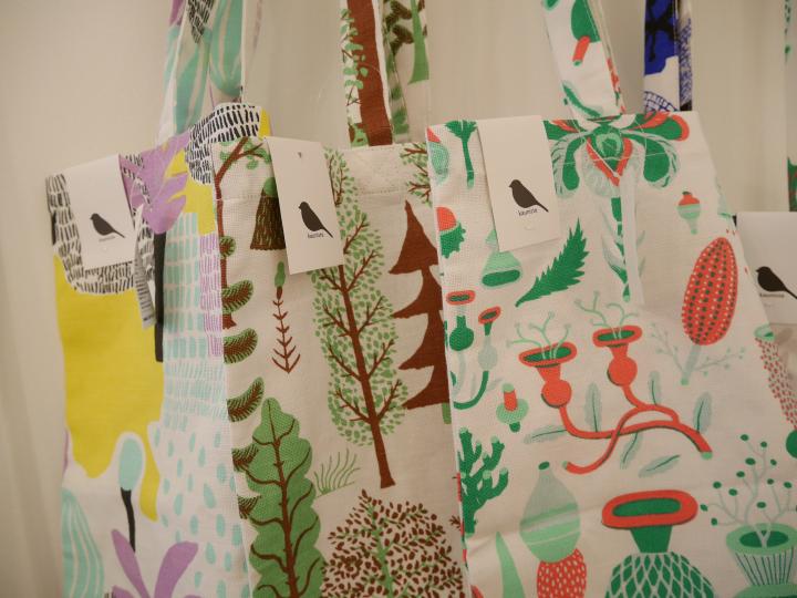 軽やかなデザインと色彩が気持ちを明るくさせてくれるトートバッグ(各3456円)も人気です。何を入れてどこへ出かけようとか、北欧からやってきたバッグに心が浮き立ちます。同柄や柄違いで「エプロン」(各5184円)もあります。