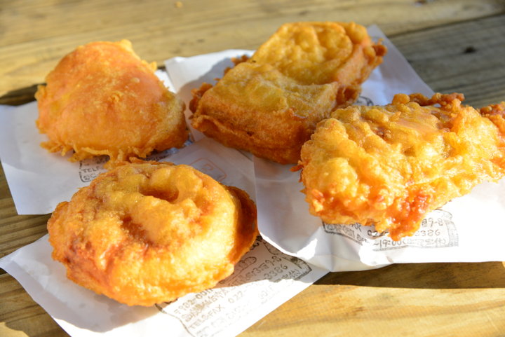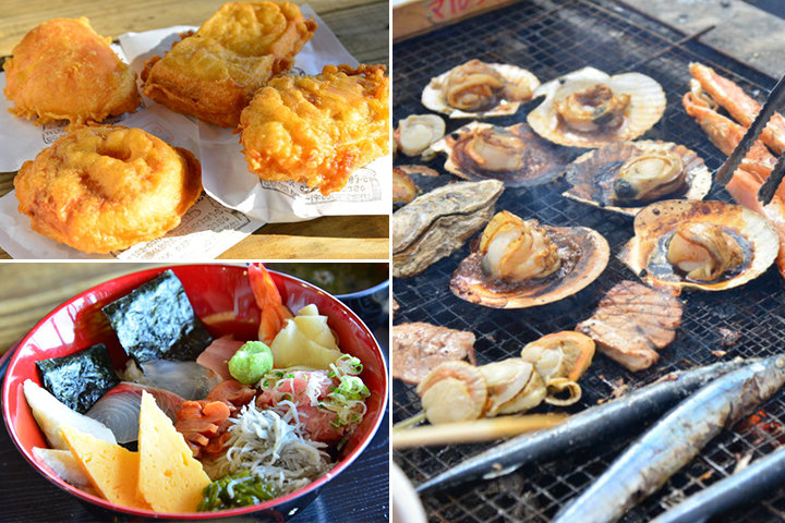 ほかにも、あんこやクリームなどをサンドしたコクのある甘みの「天ぷらパン」や、笹かまにひき肉や野菜を詰めて揚げたお総菜「笹かまん棒」など、多彩なテイクアウトグルメがラインナップ。イートインスペースのある「メイプル館」には「閖上海鮮丼」などの丼や定食も販売しているので、友だちや家族とシェアしながら食べ歩きを楽しみましょう。