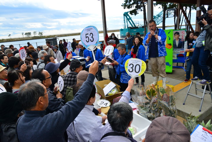 日曜日の10時からは「セリ市」も開催。誰でも無料で体験できるので気軽に挑戦してみましょう。 スタッフに番号入りのうちわをもらったら競り会場へ。ハンドベルが鳴り響いたら競りのスタートです。魚介や野菜、果物、加工品などさまざまな商品を競り人が一品ずつ掲げ「300円!」「500円!」と声を上げるので、納得のいく価格でうちわをあげましょう。人気商品は一斉に競り落とされるので、スピードが肝心ですよ。 おいしいグルメやお得なお買い物、そして店主との楽しい会話と、魅力がいっぱいの「ゆりあげ港朝市」。素敵な週末の朝を過ごしに海辺の朝市へ訪れてみませんか?