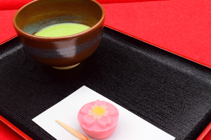園内の休憩所「吹上茶屋」では、お菓子とお抹茶で一服もできます。季節ごとに変わる生菓子は、桜のシーズンは春らしいモチーフのものがいただけます。数種類の中からどれが出てくるのかはお楽しみ。