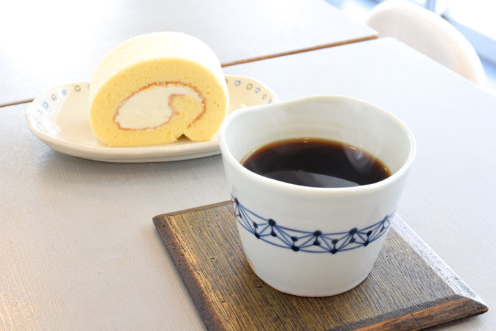 厚切りのロールケーキ(500円)。この日のコーヒー(500円)は、石川県珠洲市にある「二三味珈琲」。ニューギニアベースの深煎りブレンド