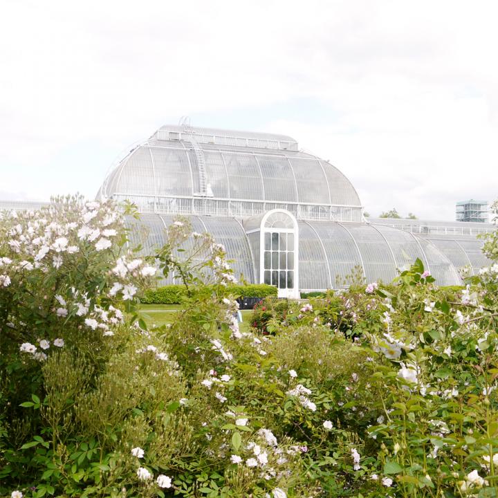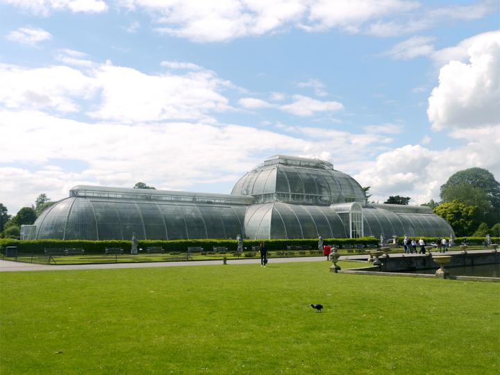 世界各地から長い時間をかけて集められた4万種を越える植物が栽培され、現在も植物の保護や研究を行う最前線の機関となっています。敷地は約120haと広大で、ガラス張りの大きな温室がいくつも点在します。また、王族が受け継いできた歴史もあり、かわいらしい宮殿も点在しています。