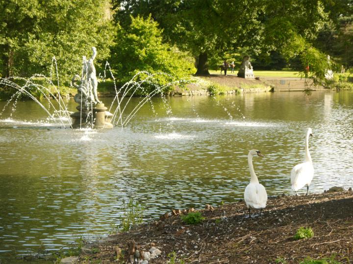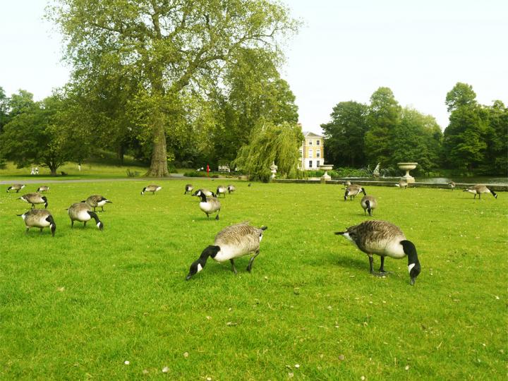 園内には鳥たちの姿も。グース(ガチョウ)が草をついばみながら歩き回り、水辺では白鳥がくつろぐ姿が見られます。