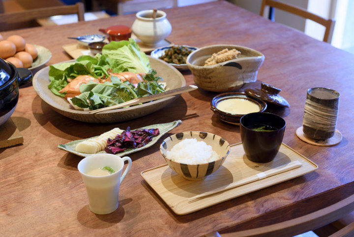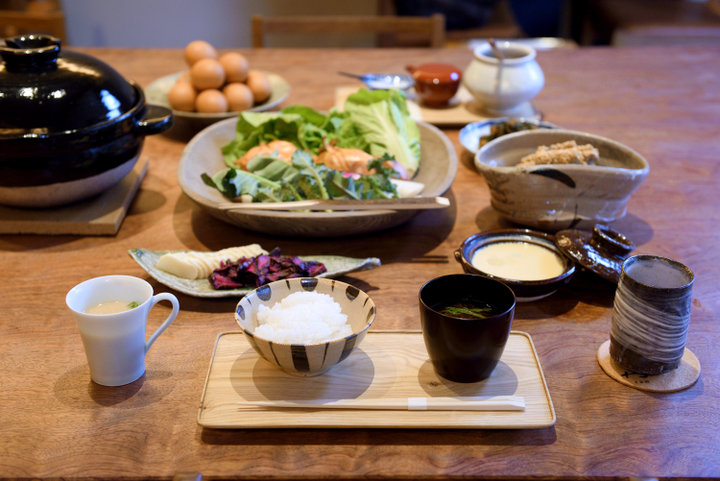 朝食はカツオのお出汁と梅干しからスタート。そして京丹後の契約農家さんから届く旬の野菜を使った料理が並べられます。この日のメニューは、雪の下白菜やタマネギなどの野菜がたっぷり盛りつけられた大皿をはじめ、たたき牛蒡と黒にんじんの胡麻和え、あさりと大根葉のしぐれ煮などのおかずが5~6品。さらに、土鍋で炊いたつややかなご飯とお味噌汁、鴨とネギの茶碗蒸しなどの一品が一人前ずつ運ばれてきます。おかずやご飯はバイキング形式なので、お皿に好きなだけとって食材の魅力を味わってみてください。