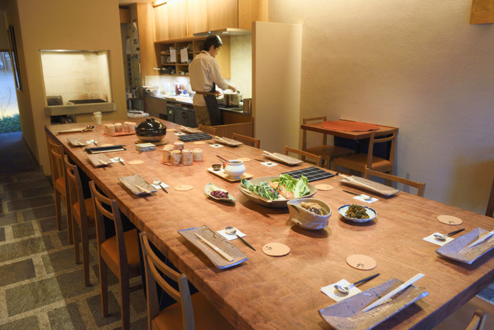 地下鉄・東山駅から徒歩すぐ、白川沿いに建つお店は朝8時からオープンします。木をふんだんに使ったぬくもりあふれる店内は全10席ほど。「お家に遊びに来たような店」をコンセプトに、1枚板の大きなテーブルとキッチンが広がっています。席に座って料理人が調理する様子を眺めていると、お出汁や土鍋で炊くご飯の香りが店内に漂い思わずほっこりする空間です。
