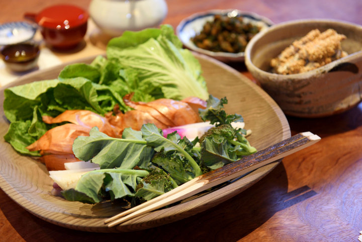 大皿の野菜は、オリーブオイルや塩、自家製の味噌などでいただく