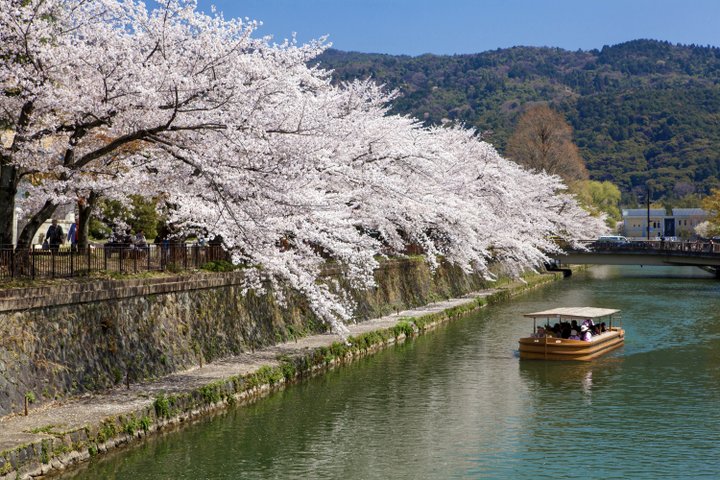 平安神宮の大鳥居前を通る岡崎疏水。春の時期には十石船が運航され、水面に乗り出す桜を眺められる