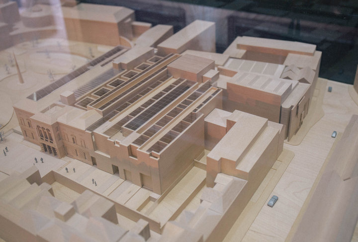 今回ご紹介する部分について、建築模型でご説明します。 右上に向かって斜めに走る車道のT字路、その角に建っているのが「National Gallery of Ireland Millennium Wing」です。 この街を走る路面電車・ルアスの駅のひとつ、セント・スティーブンス・グリーン駅から歩いて10分ほどの場所に位置しています。