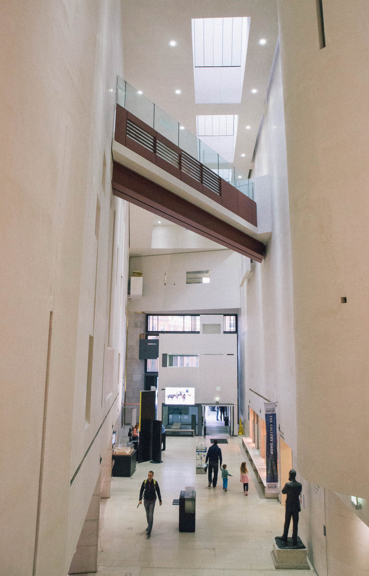 大きな吹き抜けといえば、エントランスも負けていません。 建物の材料である鉄骨の一部を見せるデザインが目を引くこの空間では、天井に切り取られた窓からはたくさんの光が降り注ぎ、くもりの日でも明るい空間を楽しむことができます。 このエントランスに立つ係員の方もとってもフレンドリー。観光客の方にはとりわけ丁寧に、この美術館のことを説明されているのが印象的でした。