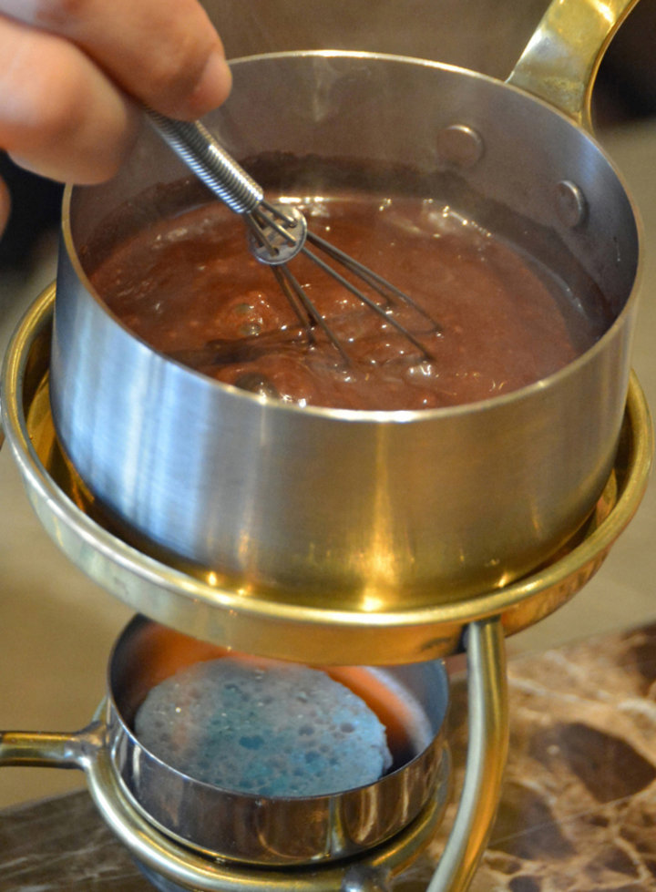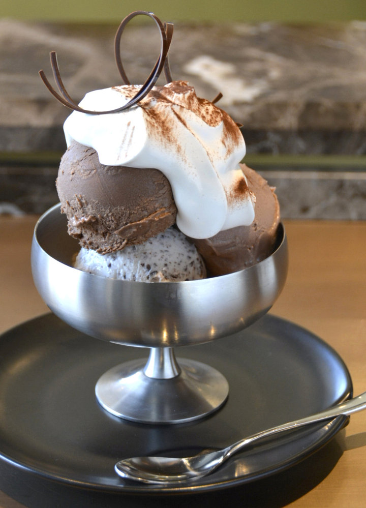本格的なショコラスイーツをゆっくり味わいたいときは、店内にあるショコラバーでイートイン限定のメニューを堪能してみてはいかが? 世界各国から選りすぐった約50種のチョコレートを使用して作る、スイーツやショコラショー(ドリンク)などがそろっています。 一番人気はショコラベースのアイスクリームが3種入ったパルフェ「トワショコラ」(950円)。フレーバーは随時変わり、この日はベルギーチョコレートとジャンドゥージャ、チョコチップでした。どんなフレーバーに出会えるかは訪れた日のお楽しみです。