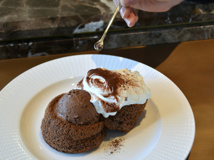 スイーツ好きに人気のパンケーキも「デリーモ」ではショコラ一色。ふんわり厚めに焼かれたスフレタイプのパンケーキに、ベルギー産チョコレートを使った自家製アイスクリームと生クリームをオン。 スタッフが目の前で温めてくれるショコラソースをかけると、焼きたてのパンケーキにアイスクリームがとろけて、思わず頬がゆるんでしまいます。