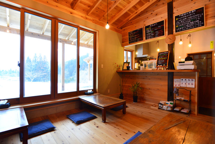 山形市街から車で30分ほど、山形と宮城の県境に近い自然豊かなエリアに「暮らしの道具と糀カフェ 晴間」はあります。スギの無垢材を使った店内はさわやかな木の香りに満ち、深呼吸したくなるようなここちよさ。ナチュラルな空間に、古い蔵の床板で作った扉やアンティークのテーブルなどレトロなアイテムが調和しています。
