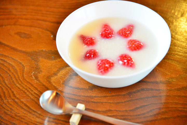 旬のフルーツと冷たい甘酒を合わせた「ごろごろ果実の生フルーツ甘酒」も人気です。ブルーベリーや甘夏、キウイフルーツなど季節によってさまざまなフルーツがラインナップ。この日はいちごをオーダーしました。果実をスプーンでつぶしながら食べるのがおすすめだそう。まろやかな甘さの甘酒にフレッシュな果肉が加わり、デザート感覚で味わえる一品です。 ほかに、シナモンを効かせた「甘酒チャイ」(626円)や、しょうが風味の「ジンジャー甘酒」(594円)などの甘酒ドリンクもあります。美容と健康によいとされるシナモンやしょうがが加わることで、“飲む点滴”といわれる甘酒がさらにパワーアップしています。