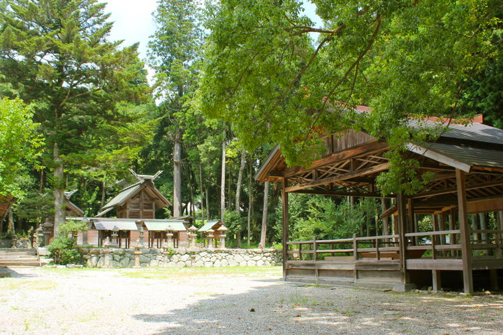 境内には神明造りの本殿と能楽を奉納するための舞台が建つ