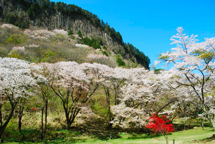 春は咲き乱れる桜と岩壁とのコントラストが圧巻