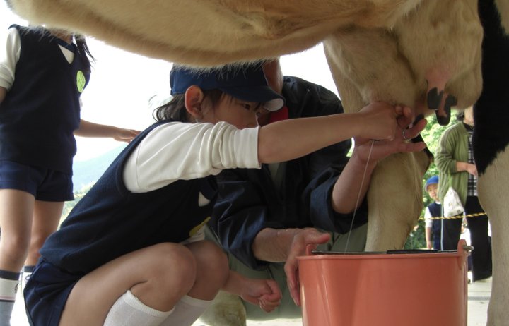 「牛の乳しぼり体験」(動物学習館での受付が必要)ではしぼった牛乳を使ってバター作りにも挑戦できる