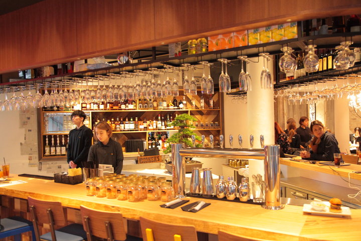 東京メトロ銀座線・表参道駅B5出口から徒歩3分。表参道から少し入った場所にあるショッピングコンプレックス「ポルトフィーノ」1階に、「ウマミバーガー」がオープンしました。こちらのレストランでは、アメリカ版『GQ』誌の“ベストバーガーオブザイヤー”に選ばれたハンバーガーがいただけるんですよ。 店内にはバーカウンターがあり、シャンデリアが飾られていて、大人が楽しめる雰囲気。カリフォルニアワイン、ビール、カクテルなどのお酒もそろっています。