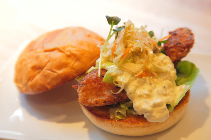 2品目の「ユウナミバーガー」(1382円)は、新鮮な白身魚(真鱈)のフライに、ハーブを使った自家製タルタルソースをかけたバンズ。口に入れた瞬間、隠し味に使われているカレーの風味を感じて、後を引くおいしさです。 ちなみに、メニューにあるすべてのバンズは、レタスラップに変更することもできます。肉や魚を使わないパテもあり、ベジタリアンが少なくないアメリカならではのサービスですね。ダイエット中の人にも良さそう。フライドエッグ(108円)やアップルウッドスモークベーコン(216円)など、トッピングも自由に追加できるので、自分好みの食べ方を探してみては?