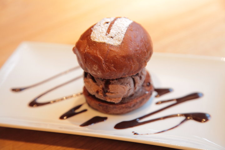 デザートメニューもあり、ミニサイズのオリジナルチョコレートバンズに、アイスクリームがはさんであります。「チョコレートスライダー チョコレートソース」(540円)の中に入っているのは、濃厚チョコレートアイスクリーム。チョコレートとチョコレートという組み合わせですが、ほどよい甘さで、大人の味です。